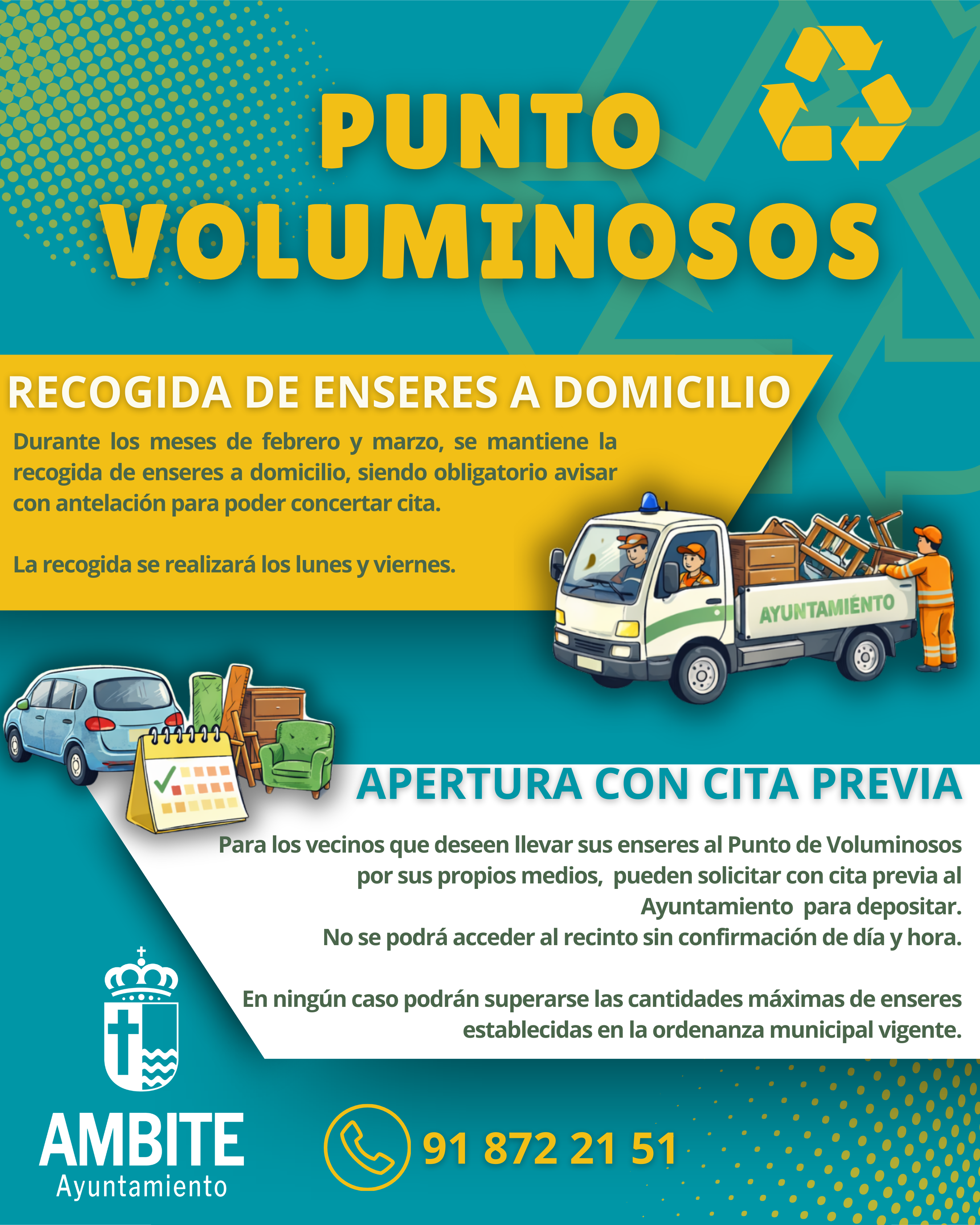 E l Ayuntamiento de Ambite informa a los vecinos y vecinas sobre el funcionamiento del servicio de recogida de enseres y Punto de Voluminosos, recordando la obligatoriedad de solicitar cita previa y el cumplimiento de la ordenanza municipal vigente.